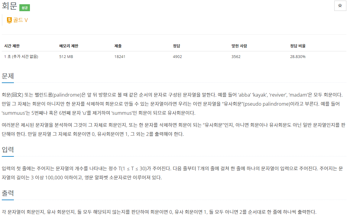 각 문자열이 회문인지, 유사 회문인지, 둘 모두 해당되지 않는지를 판단하여 회문이면 0, 유사 회문이면 1, 둘 모두 아니면 2를 순서대로 한 줄에 하나씩 출력한다.
