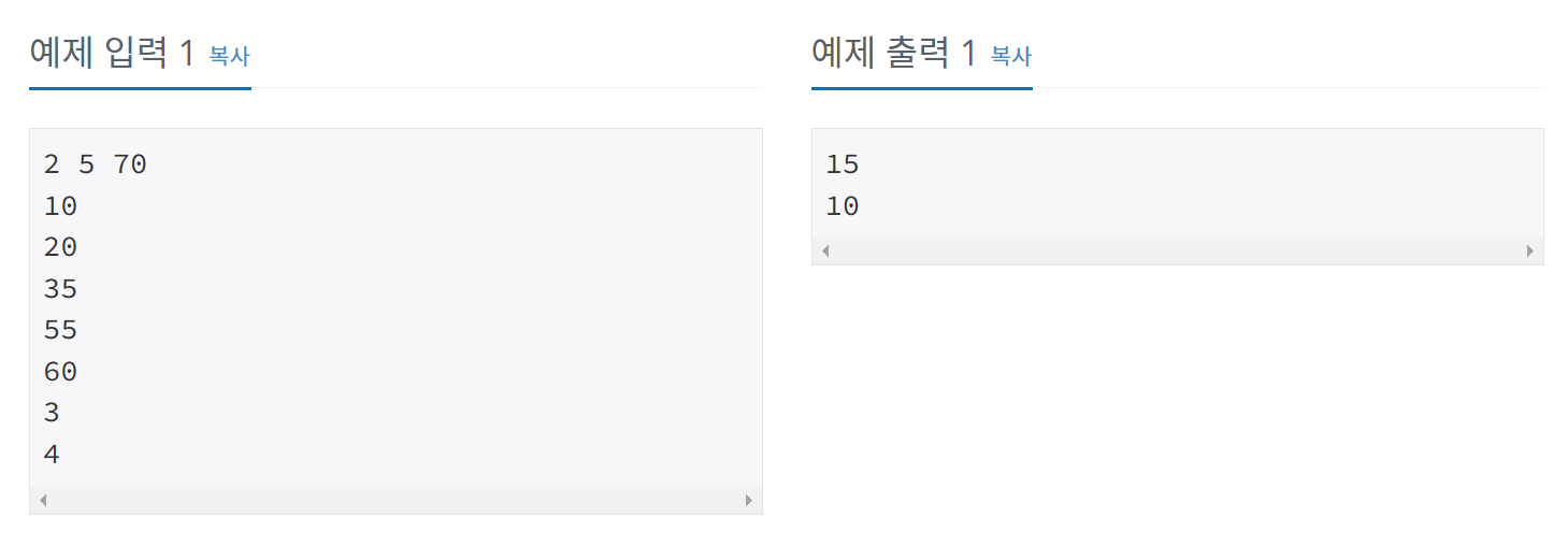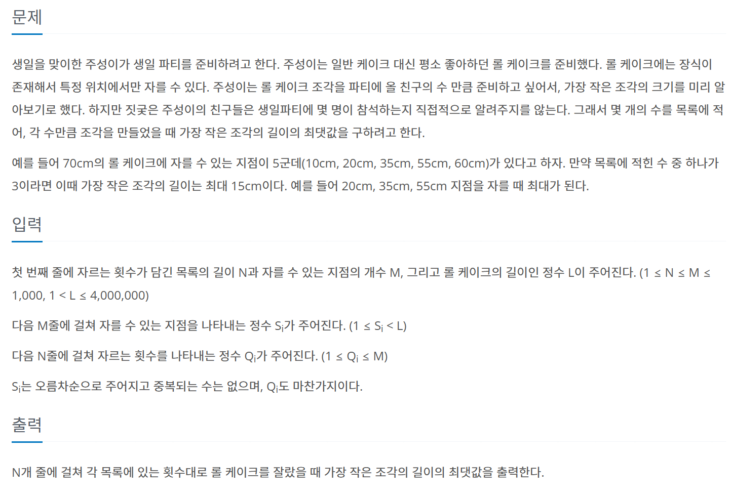 첫 번째 줄에 자르는 횟수가 담긴 목록의 길이 N과 자를 수 있는 지점의 개수 M, 그리고 롤 케이크의 길이인 정수 L이 주어진다. (1 ≤ N ≤ M ≤ 1,000, 1 < L ≤ 4,000,000) 다음 M줄에 걸쳐 자를 수 있는