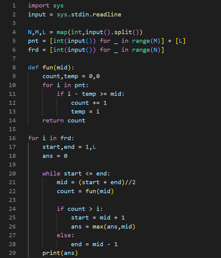 - N,M,L과 M개의 자를 수 있는 지점을 나타내는 정수 리스트 pnt, N명의 예상 친구 수를 나타내는 정수 리스트 frd 입력