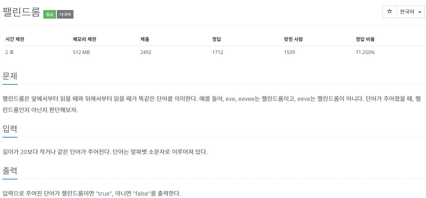 3. str과 strReverse가 같으면 "true"를 출력하고 같지 않으면 "false"를 출력한다.