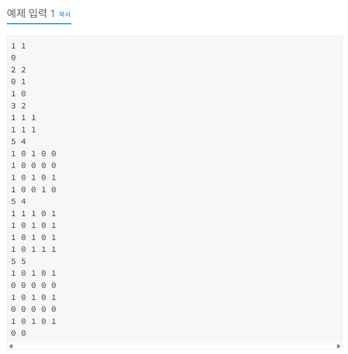 입력은 여러 개의 테스트 케이스로 이루어져 있다. 각 테스트 케이스의 첫째 줄에는 지도의 너비 w와 높이 h가 주어진다. w와 h는 50보다 작거나 같은 양의 정수이다. 둘째 줄부터 h개 줄에는 지도