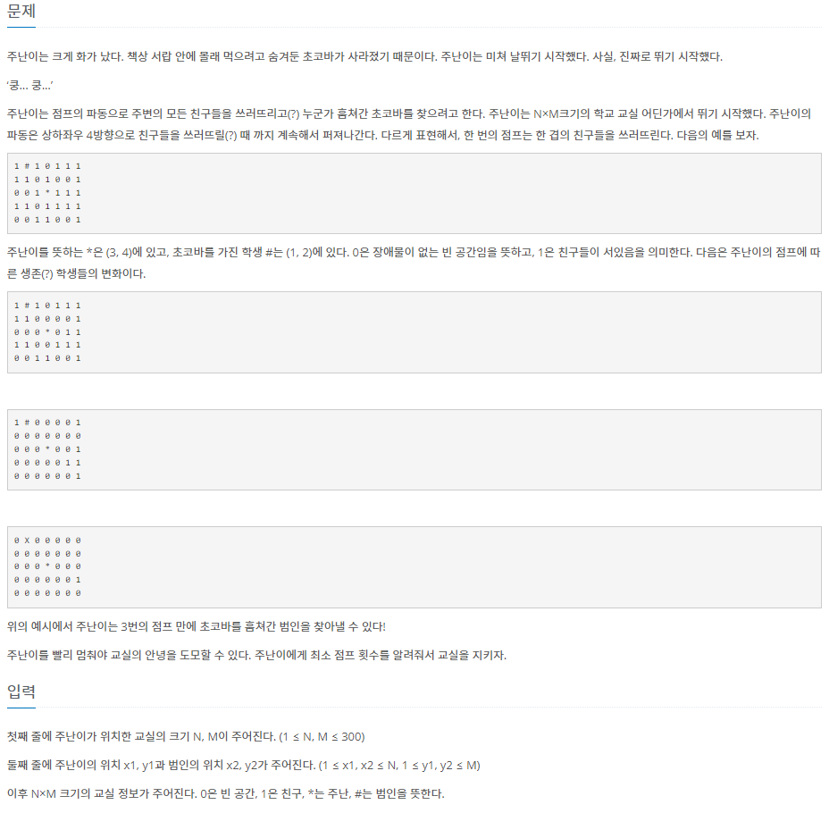 주난이가 점프를 뛸 때마다 주난이와 이어진 0 주변의 1들이 사라진다고 생각하면 된다. 이것만 보고는 백준의 다른 너비우선탐색 문제들과 했갈릴 수 있지만 더 효율적으로 푸는 방법은 다익스트라이다. 그 이유는 0으로 된 부분을 이동하는데 가중치가 0이고, 1을 0으로 바꾸는데 가중치가 1이 들어가는 그래프로 생각하고 풀어줄 수 있기 때문이다.