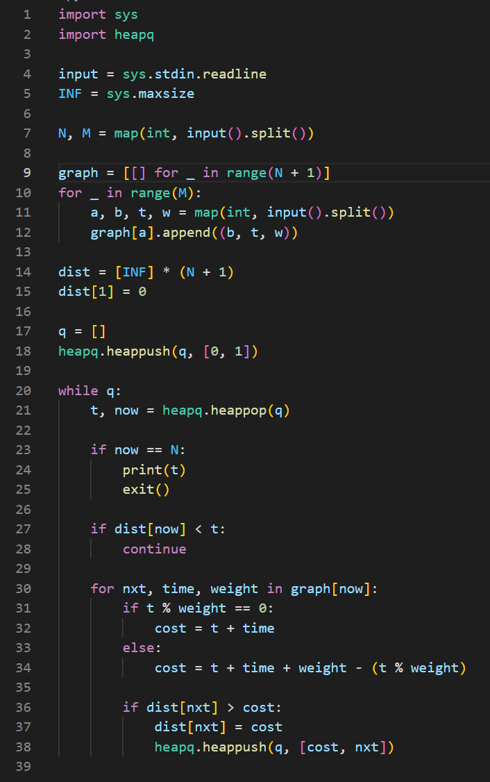 - q에서 pop을 실행해 t와 now를 꺼내 해당 역으로의 최소 시간 갱신