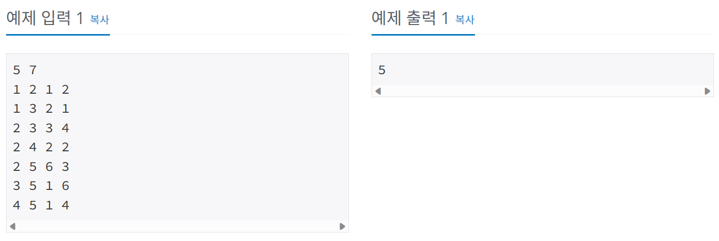 첫째 줄에 역의 수 N(2 ≤ N ≤ 20,000)과 노선 M개(1 ≤ M ≤ 300,000)가 주어진다. 둘째 줄 부터 M개의 줄에 걸쳐서 4개의 정수 A, B, T, W가 주어지고 A역에서 B역으로 가는 단방향 노선이 존재하며, 소요