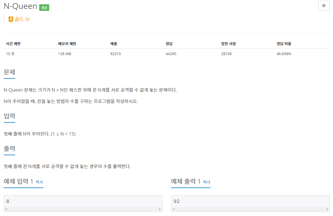 N-Queen 문제는 크기가 N × N인 체스판 위에 퀸 N개를 서로 공격할 수 없게 놓는 문제이다. N이 주어졌을 때, 퀸을 놓는 방법의 수를 구하는 프로그램을 작성하시오.