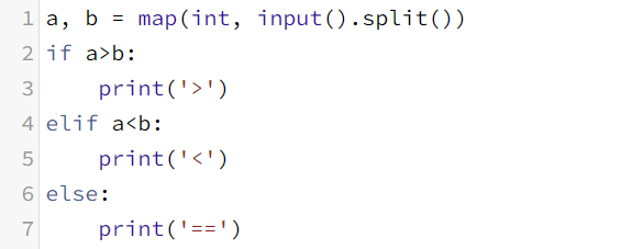 2. a가 b보다 클 경우에는 '>'를 출력하고, a가 b보다 작을 때는 '<'를 출력하며 a와b가 같을 경우에는 '=='를 출력하라는 조건이 있으므로 이를 따라 조건문을 작성해준다.