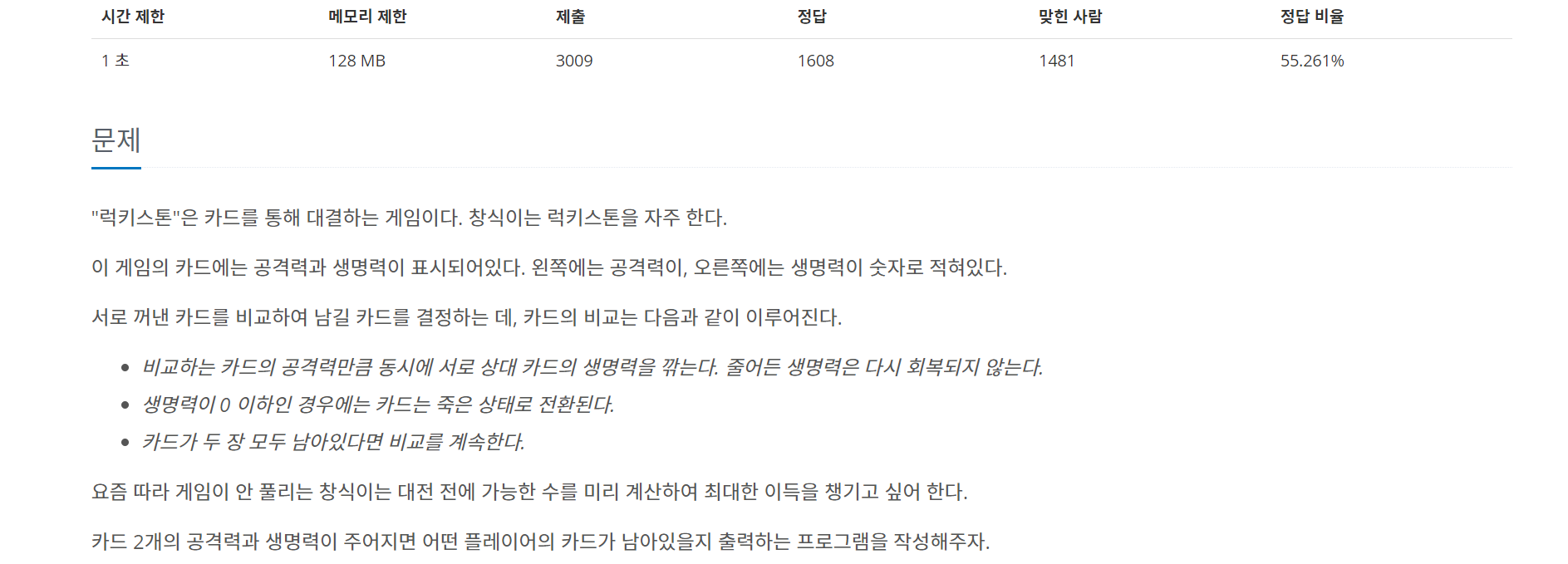 카드의 공격력과 생명력이 주어지면 어떤 플레이어의 카드가 남아있는지 출력한다.