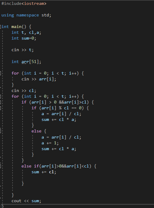 테스트케이스 개수를 의미하는 변수 t, 클러스터의 크기를 의미하는 변수 cl, 계산에서 사용하기 위해 변수 a를 선언함. 그리고 출력을 위해 클러스트의 크기들을 더한 변수 sum , 파일 크기를 저장하는 배열 arr을 선언함. 그 후 for문을 사용하여 배열값을 입력받고 cl의 값 또한 입력받음. 그 후 한번 더 for문을 사용하고 for문 안에 파일의 크기가 0과 cl보다 큰 경우와 0보단 크지만 cl보단 작은 경우를 나누는 조건문을 사용하여 계산을 진행함. 마지막에 sum값을 출력해줌.