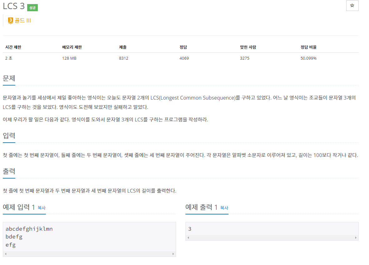 기존 LCS코드에(2중 for문)에 한 줄을 더 늘려주면 된다. 그렇게 되면 3개가 같을 경우 +1이 되므로 사실 2개일 때랑 별 차이가 없는 문제이다. (4개라면 4중, 5개라면 5중으로 굴려주면 될 것이다. 시간복잡도가 N^5인 것만 감안하면..!)