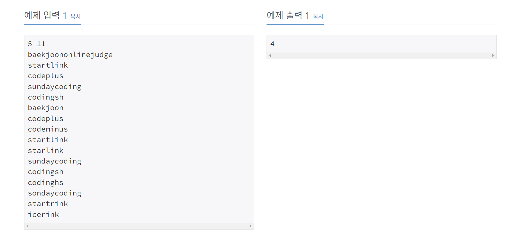 입력으로 주어지는 문자열은 알파벳 소문자로만 이루어져 있으며, 길이는 500을 넘지 않는다. 집합 S에 같은 문자열이 여러 번 주어지는 경우는 없다.
