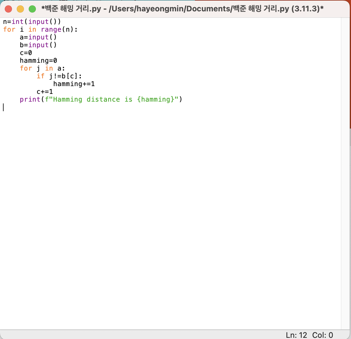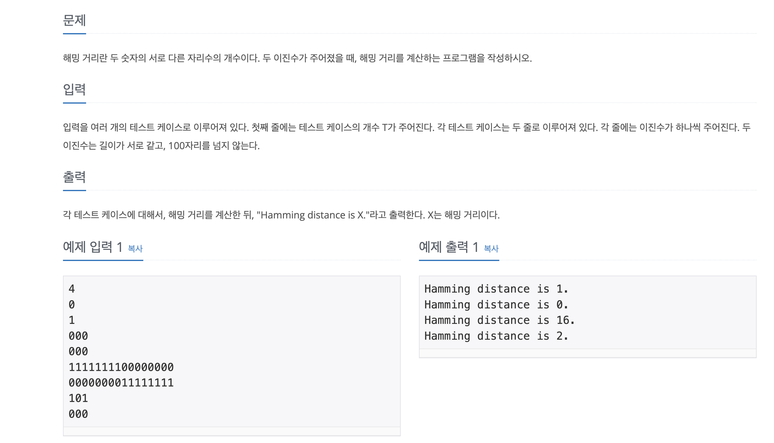 3.그리고 T만큼 반복되는 반복문 안에 한 이진수를 기준으로 그 이진수의 첫글자씩 다른 이진수와 비교하는 반복문을 작성해준다. 서로 다른 자리수일때마다 hamming의 값을 1씩 더해준다