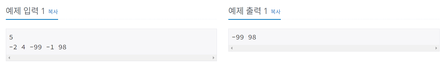 첫째 줄에는 전체 용액의 수 N이 입력된다. N은 2 이상 100,000 이하이다. 둘째 줄에는 용액의 특성값을 나타내는 N개의 정수가 빈칸을 사이에 두고 주어진다. 이 수들은 모두 -1,000,000,000 이상 1,000,00