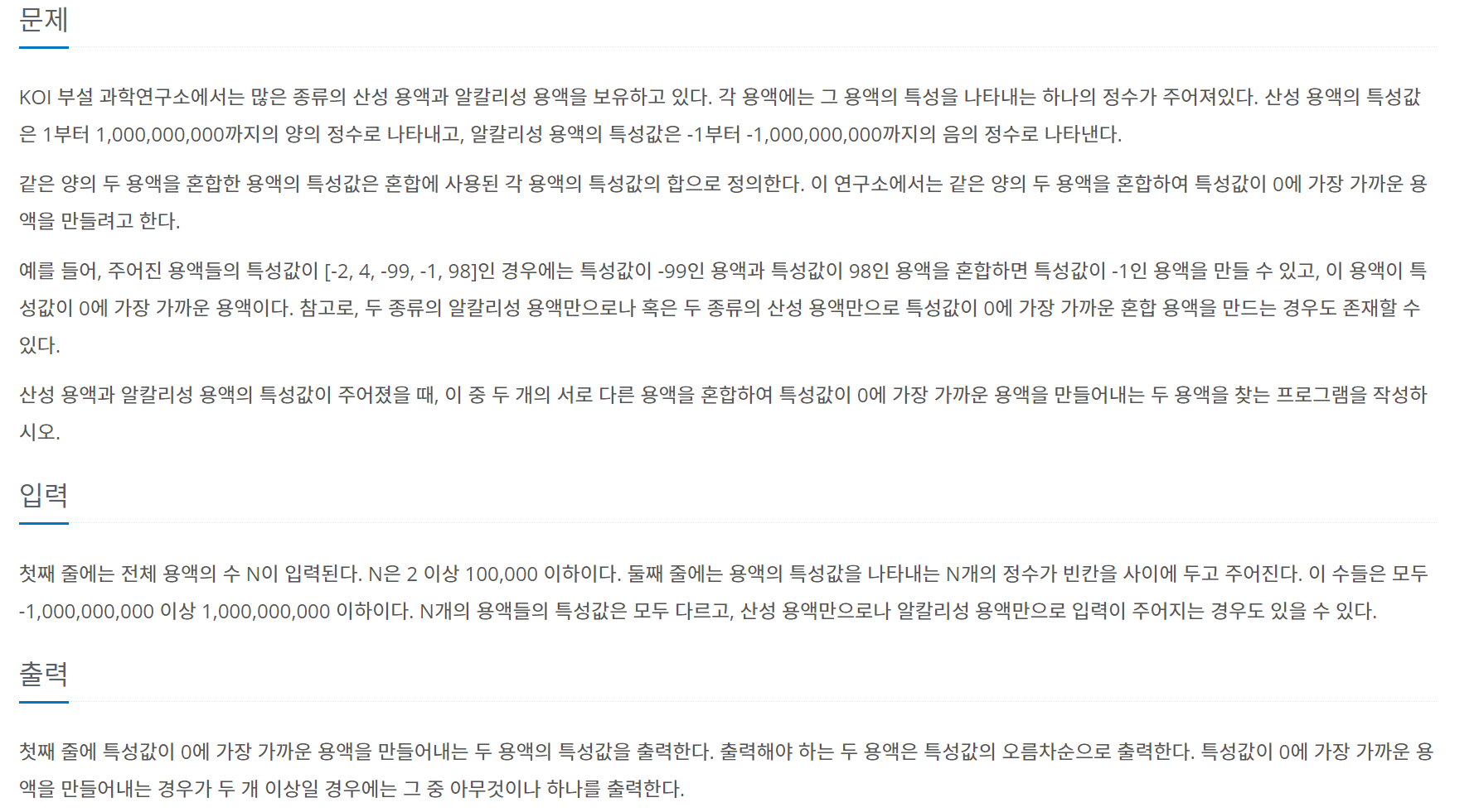 이 문제는 먼저 정렬 후 맨 앞과 끝에 포인터 두고 점점 가운데로 움직이며 합이 0과 가까워지게 만드는 아이디어를 사용한다
