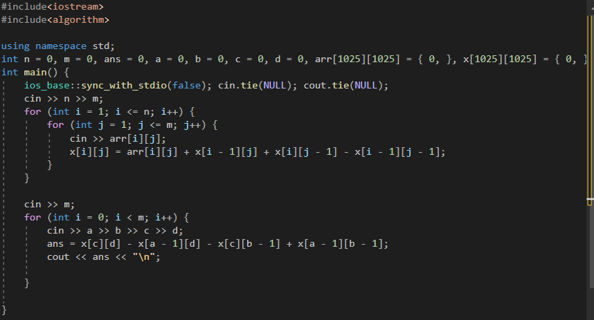 영토의 크기를 뜻하는 변수 n,m 과 출력할 누적합 변수 ans, 직사각형의 범위를 뜻하는 변수 a,b,c,d 와 영토의 사람들의 수를 입력받을 배열 arr, 누적합 계산을 저장할 배열 x 을 선언했습니다. 처음에 변수 선언을 할 때 main 문 안에다 두었는데 전역변수로 두지 않으면 중복 계산이 이루어져 시간 초과 오류가 뜨는 듯 합니다. 그래서 전역변수로 선언해주고 main 문 안에서 코드를 작성해도 오류가 떴었는데 ios_base::sync_with_stdio(false); cin.tie(NULL); cout.tie(NULL); 구문을 추가해주니 시간 초과 오류가 해결됐습니다. 그 후 이중 for 문을 사용하여 arr배열의 값들을 입력받습니다. 그리고 그 값들을 x배열에 합해서 넣어 누적합을 저장하는 x배열의 값들을 채워넣습니다. 그 후 원하는 반복횟수를 입력받고 for문을 사용하여 반복횟수 만큼 원하는 범위의 합들을 출력해줍니다.