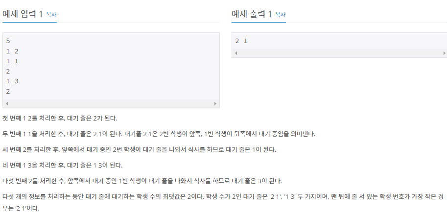 첫 번째 정보부터 n번째 정보까지 순서대로 처리한 다음, 식당 입구에 줄을 서서 대기하는 학생 수가 최대가 되었던 순간의 학생 수와 이때 식당 입구의 맨 뒤에 대기 중인 학생의 번호를 빈칸을