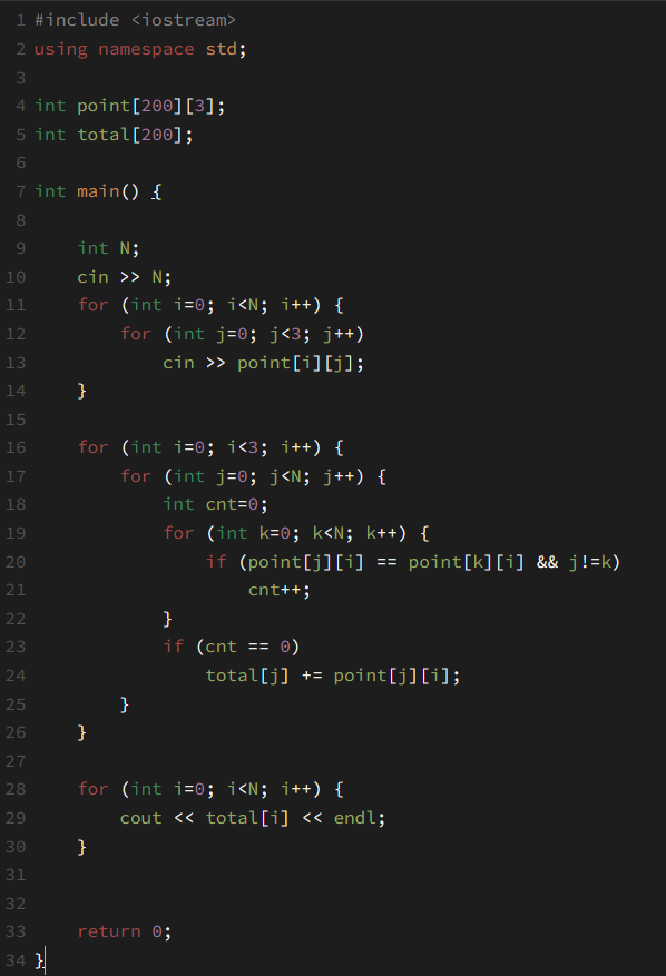 첫째 줄에 참가자의 수 N이 주어진다. (2 ≤ N ≤ 200) 둘째 줄부터 N개 줄에는 각 플레이어가 1번째, 2번째, 3번째 게임에서 쓴 수가 공백으로 구분되어 주어진다.