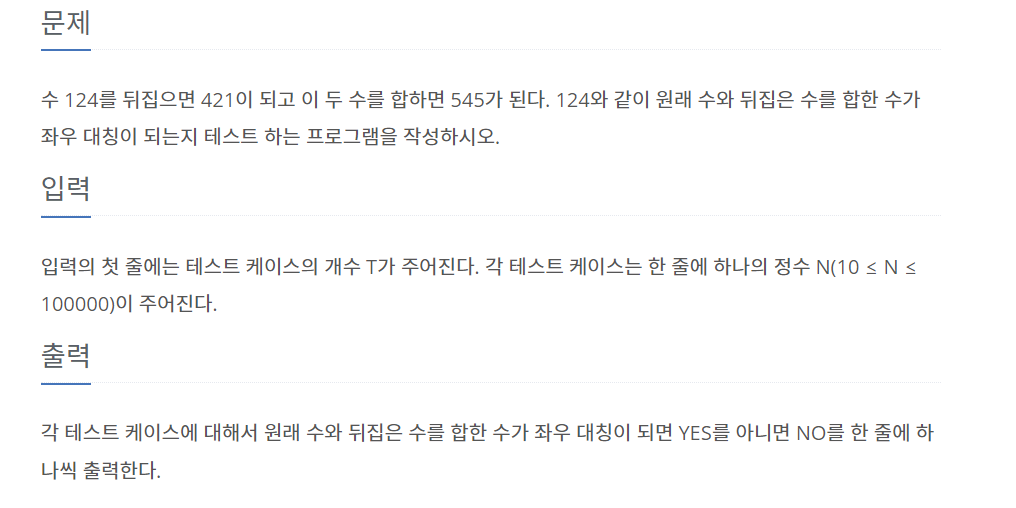 테스트 케이스의 개수를 받고 원래 수와 뒤집은 수를 합한 값이 좌우대칭이 되는지를 확인하는 코드를 만든다.