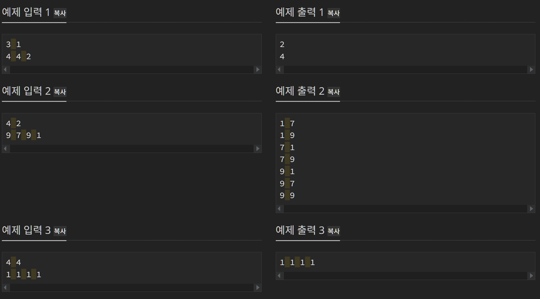 한 줄에 하나씩 문제의 조건을 만족하는 수열을 출력한다. 중복되는 수열을 여러 번 출력하면 안되며, 각 수열은 공백으로 구분해서 출력해야 한다.
