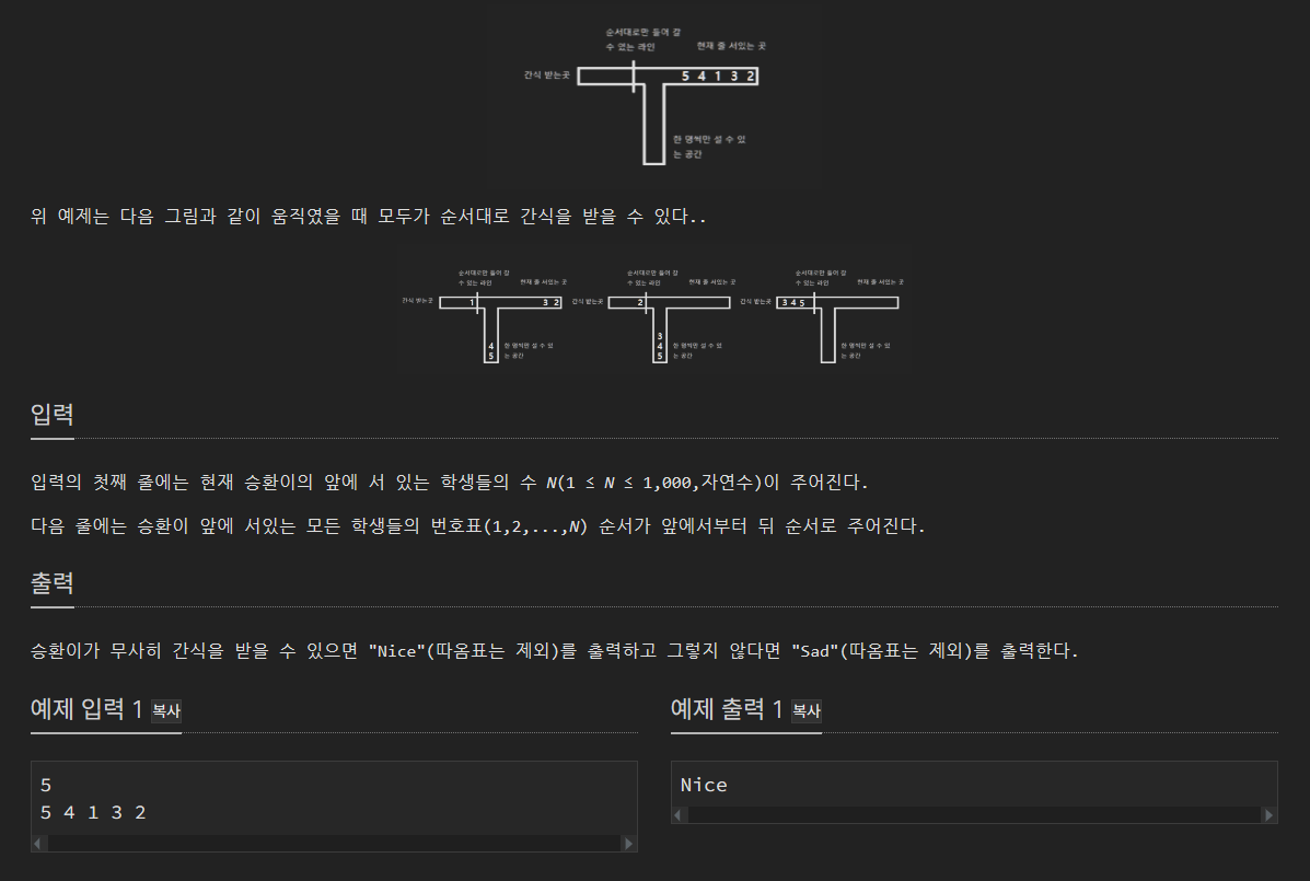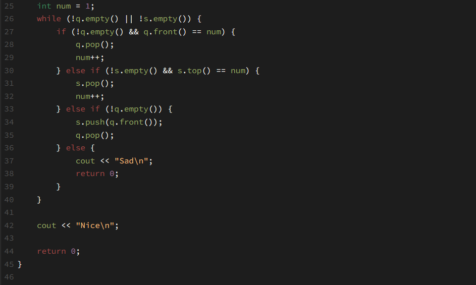 while문을 통해서 큐하고 스택이 둘다 빌 때까지 반복을 해주었고, 반복하는 도중, 큐의 front값이 해당 num값과 같다면 옳바른 순서이므로 바로 pop을 시키고 num값을 증가시켜서 다음 순서를 알아 볼 수 있도록 하였다. 또한, 만약에 스택의 top값이 해당 num값과 같다면 pop을 시키고 num값을 증가시켰다. 위의 두 가지 경우를 성립하지 않고 큐가 비어있지 않은 경우, 스택에 값을 넣어주고 pop시켜 주었다. 만약 위의 모든 조건문에 성립하지 않는다면, 주어진 대기줄은 성공적으로 성립할 수 없으므로 에러를 뜻하는 Sad를 출력해주고 함수를 끝내버렸다.