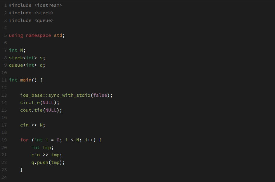 위 문제를 보시면, 우측에서 대기하는 줄은 큐의 특성을 가지고 있고 좌측 아래에서 대기하는 줄은 스택의 특성을 가지고 있다. 따라서, 먼저 해당 대기줄에 대해서 큐와 스택을 선언해 주었다.
