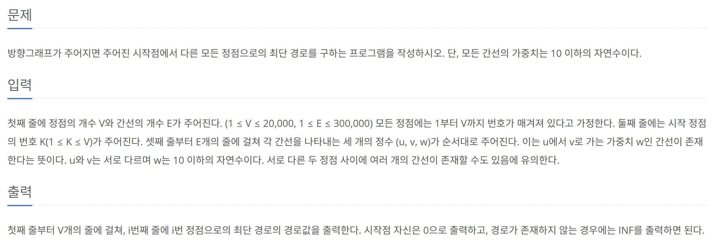 변수 및 데이터 입력**: `n`, `m`, `k`를 입력받는다. `INF`라는 상수를 사용하여 무한을 나타낸다. `INT_MAX`는 C++에서 정수의 최댓값을 나타내는 상수이다. `graph`는 정점과 간선 정보를 저장하는 2차원 벡터이고 `distance`는 각 정점까지의 최단 거리를 저장하는 배열로 초기값은 모두 무한으로 설정한다. `m`번 만큼 간선 정보를 입력받아 `graph`에 저장하고 각 간선은 시작 노드, 도착 노드, 비용으로 구성한다. `dijkstra` 함수를 정의한다. 우선순위 큐 `q`를 사용하여 노드까지의 최단 거리를 기준으로 노드를 선택하고 알고리즘을 통해 시작 노드로부터 각 노드까지의 최단 거리를 계산하고 `distance` 배열에 저장한다. `dijkstra` 함수를 호출하여 시작 노드 `k`로부터 모든 노드까지의 최단 거리를 계산하고 각 노드까지의 최단 거리를 출력한다. 만약 해당 노드까지의 거리가 무한대인 경우 "INF"를 출력하고 아닌 경우에는 실제 최단 거리를 출력한다.