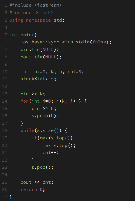 입력을 끝낸 후, 스택을 돌아보면서, 임의의 변수 max에 현재까지의 막대기의 최고 높이를 저장한 후, 더 큰 높이를 가진 막대기를 가진 경우에만 cnt변수에 값을 추가해주고, max변수를 바꿔주는 방식으로 해결을 하였다.