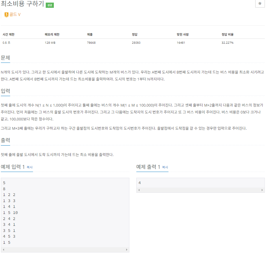 첫째 줄에 도시의 개수 N(1 ≤ N ≤ 1,000)이 주어지고 둘째 줄에는 버스의 개수 M(1 ≤ M ≤ 100,000)이 주어진다. 그리고 셋째 줄부터 M+2줄까지 다음과 같은 버스의 정보가 주어진다. 먼저 처음에는 그