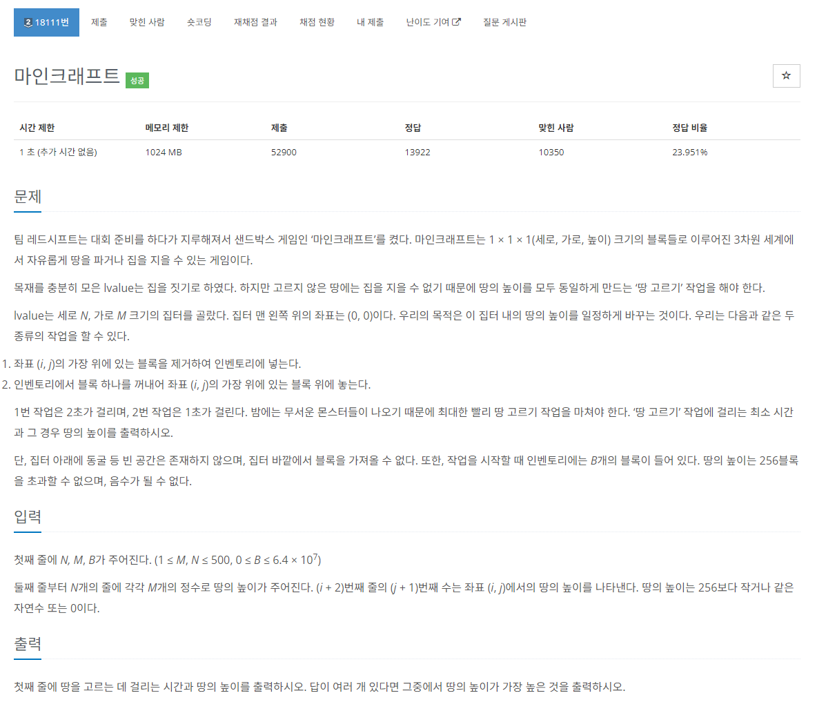 각 높이를 돌면서, 평평하게 만드는데 드는 시간과 블럭을 체크하였고, 블럭이 부족하다면 답으로 기록하지 않았다.