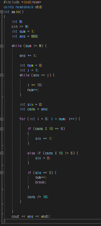 3. sum이 N과 같아지면 N번째 종말의 수가 있는 수를 찾게되므로 ans를 출력한다.
