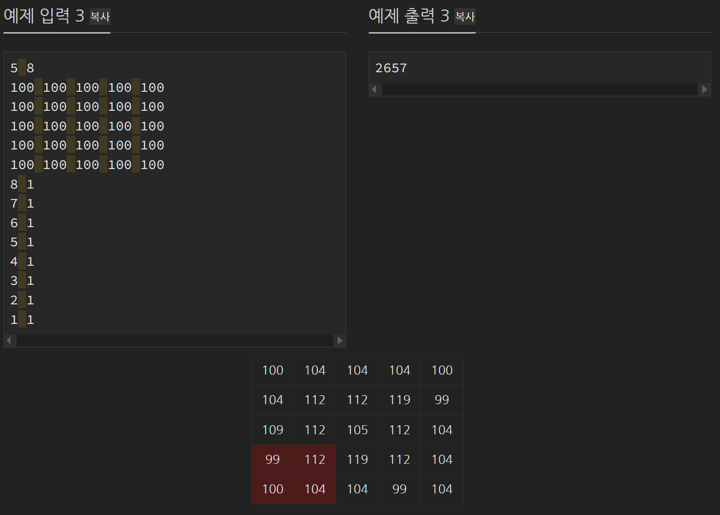 첫째 줄에 M번의 이동이 모두 끝난 후 바구니에 들어있는 물의 양의 합을 출력한다