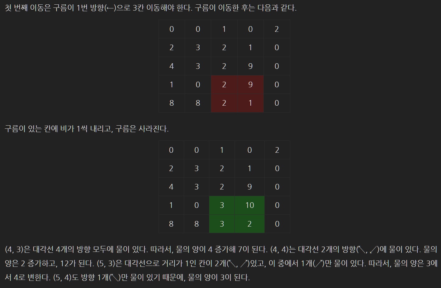 2. 각 구름에서 비가 내려 구름이 있는 칸의 바구니에 저장된 물의 양이 1 증가한다.