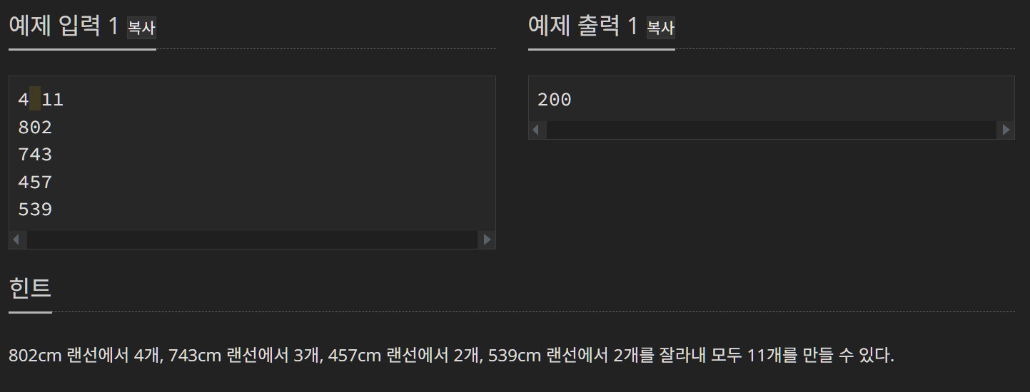 이미 오영식은 자체적으로 K개의 랜선을 가지고 있다. 그러나 K개의 랜선은 길이가 제각각이다. 박성원은 랜선을 모두 N개의 같은 길이의 랜선으로 만들고 싶었기 때문에 K개의 랜선을 잘라서 만들어야 한다. 예를 들어 300cm 짜리 랜선에서 140cm 짜리 랜선을 두 개 잘라내면 20cm는 버려야 한다. (이미 자른 랜선은 붙일 수 없다.)