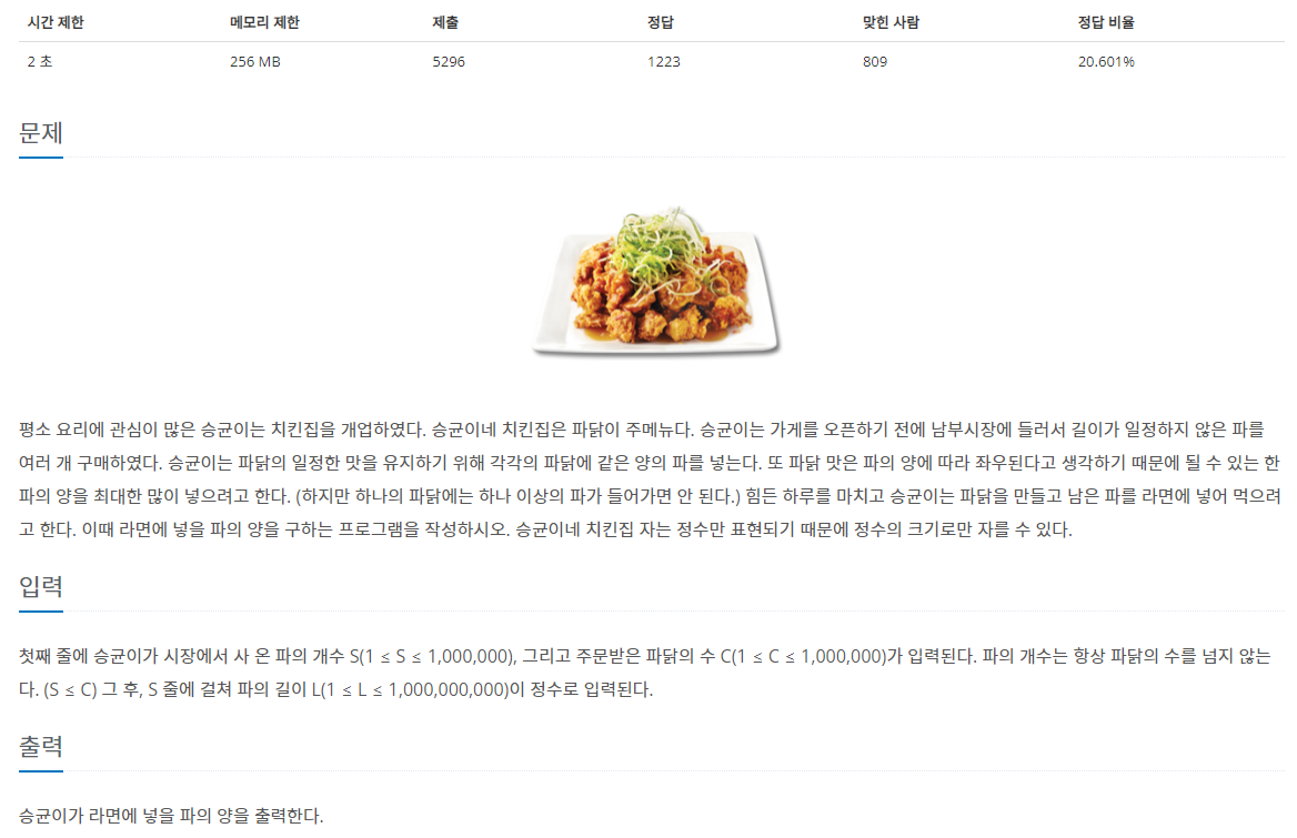 첫째 줄에 승균이가 시장에서 사 온 파의 개수 S(1 ≤ S ≤ 1,000,000), 그리고 주문받은 파닭의 수 C(1 ≤ C ≤ 1,000,000)가 입력된다. 파의 개수는 항상 파닭의 수를 넘지 않는다. (S ≤ C) 그 후, S 줄에