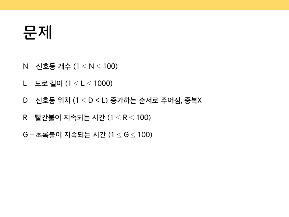 상근이는 트럭을 가지고 긴 일직선 도로를 운전하고 있다. 도로에는 신호등이 설치되어 있다. 상근이는 각 신호등에 대해서 빨간 불이 지속되는 시간과 초록 불이 지속되는 시간을 미리 구해왔