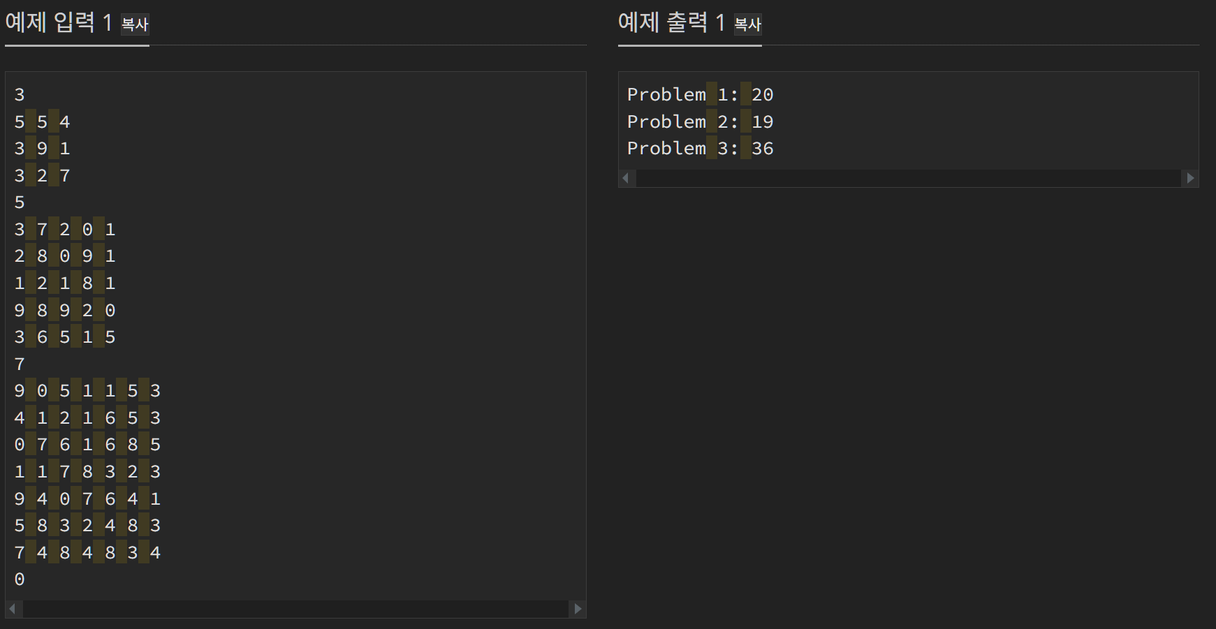 하여튼 젤다...아니 링크는 이 동굴의 반대편 출구, 제일 오른쪽 아래 칸인 [N-1][N-1]까지 이동해야 한다. 동굴의 각 칸마다 도둑루피가 있는데, 이 칸을 지나면 해당 도둑루피의 크기만큼 소지금을 잃게 된다. 링크는 잃는 금액을 최소로 하여 동굴 건너편까지 이동해야 하며, 한 번에 상하좌우 인접한 곳으로 1칸씩 이동할 수 있다.