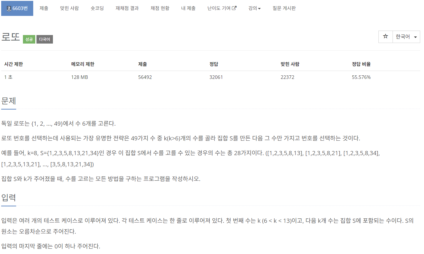 k개의 수가 주어지고, 이 수들 중에서 6개의 무작위 조합을 뽑아내는 문제이다.