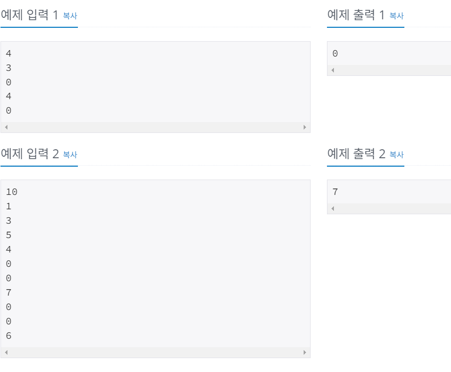 이후 K개의 줄에 정수가 1개씩 주어진다. 정수는 0에서 1,000,000 사이의 값을 가지며, 정수가 "0" 일 경우에는 가장 최근에 쓴 수를 지우고, 아닐 경우 해당 수를 쓴다.