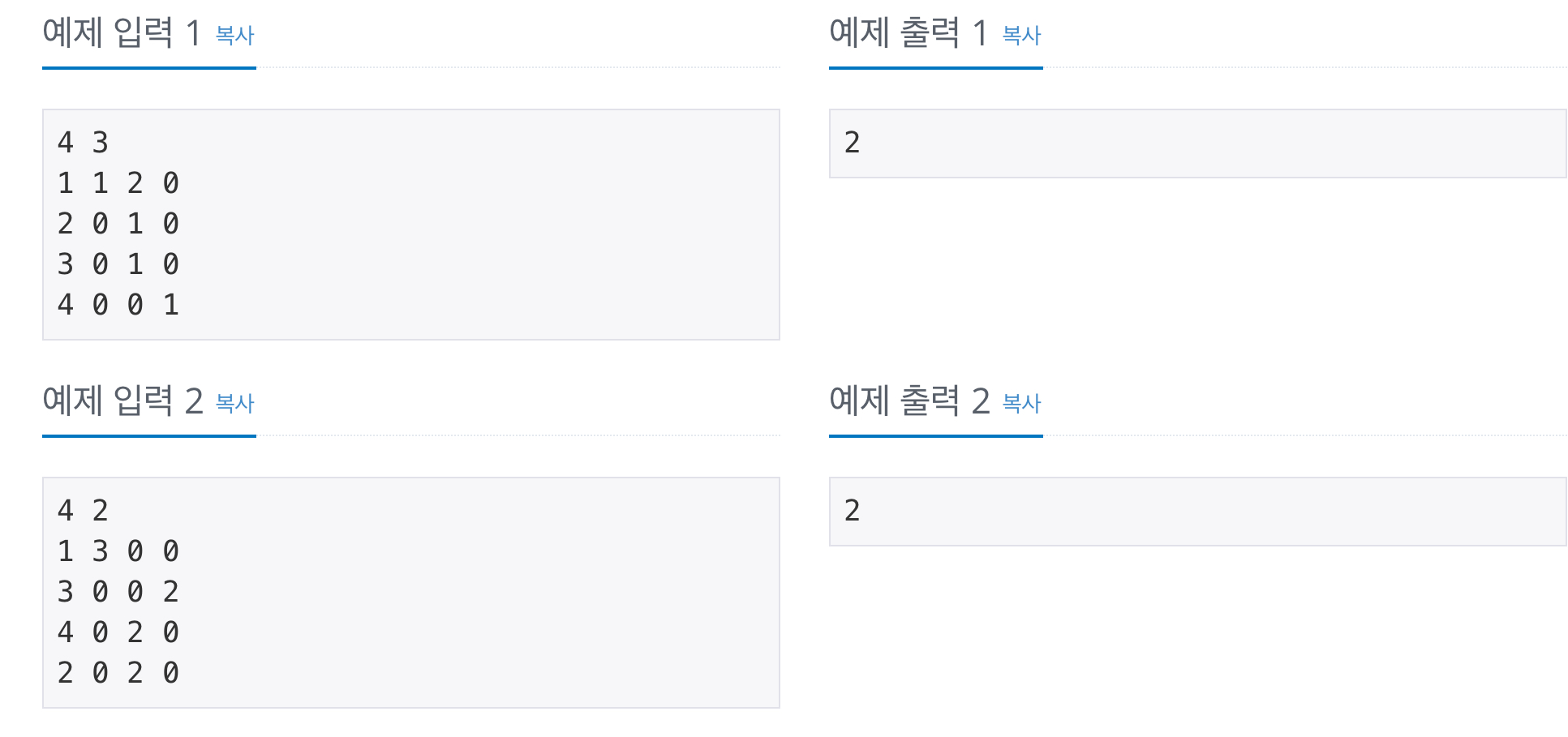 입력의 첫 줄은 국가의 수 N(1 ≤ N ≤ 1,000)과 등수를 알고 싶은 국가 K(1 ≤ K ≤ N)가 빈칸을 사이에 두고 주어진다. 각 국가는 1부터 N 사이의 정수로 표현된다. 이후 N개의 각 줄에는 차례대로 각 국가를 나타내는 정수와 이 국가가 얻은 금, 은, 동메달의 수가 빈칸을 사이에 두고 주어진다. 전체 메달 수의 총합은 1,000,000 이하이다.