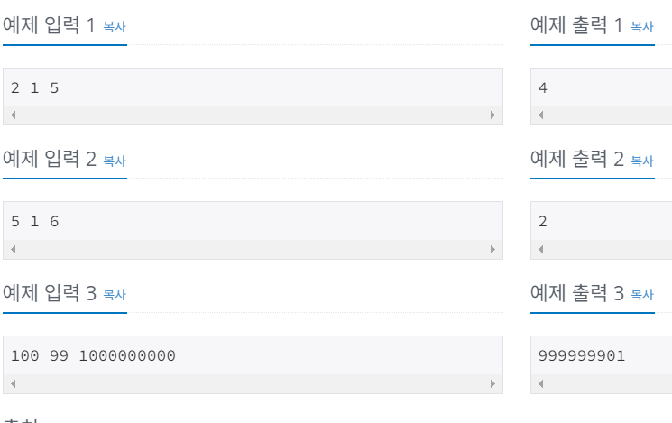 첫째 줄에 세 정수 A, B, V가 공백으로 구분되어서 주어진다. (1 ≤ B < A ≤ V ≤ 1,000,000,000)