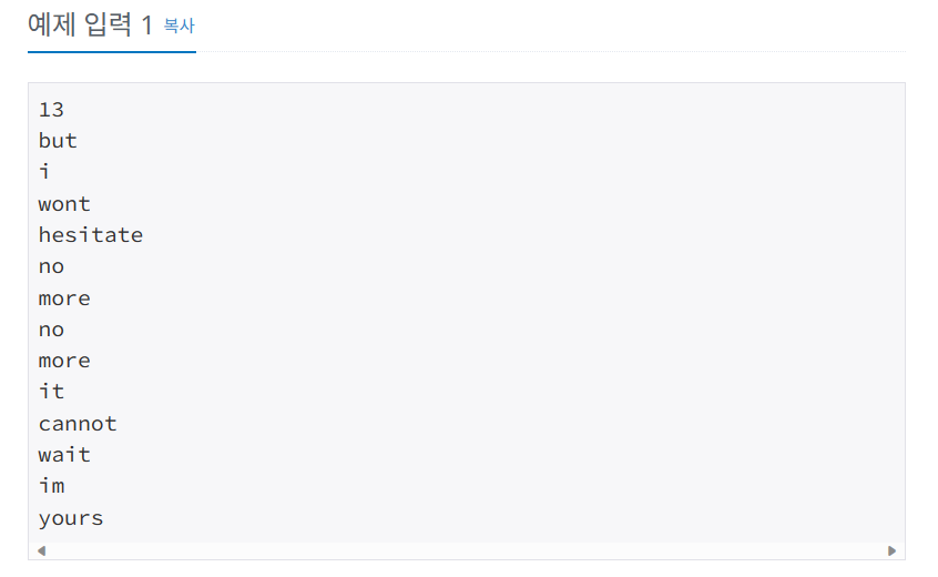 첫째 줄에 단어의 개수 N이 주어진다. (1 ≤ N ≤ 20,000) 둘째 줄부터 N개의 줄에 걸쳐 알파벳 소문자로 이루어진 단어가 한 줄에 하나씩 주어진다. 주어지는 문자열의 길이는 50을 넘지 않는다.