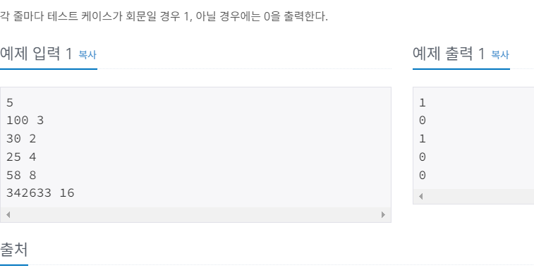 - 결과를 뒤집은 후 회문이면 1 아니면 0을 출력한다