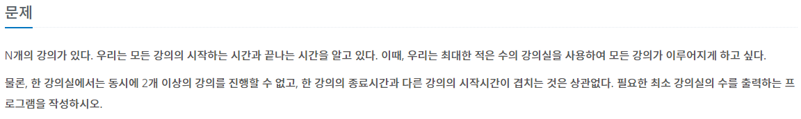 강의 시간이 겹치지 않고 배정하기 위해 필요한 최소한의 강의실 개수를 구하라