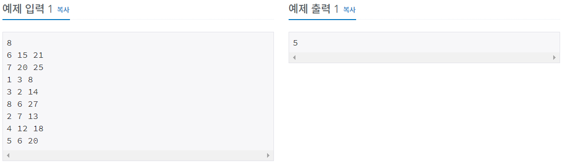 첫째 줄에 강의의 개수 N(1≤N≤100,000)이 주어진다. 둘째 줄부터 N개의 줄에 걸쳐 각 줄마다 세 개의 정수가 주어지는데, 순서대로 강의 번호, 강의 시작 시간, 강의 종료 시간을 의미한다. 강의 번