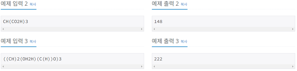 첫째 줄에 화학식이 주어진다. 화학식은 H, C, O, (, ), 2, 3, 4, 5, 6, 7, 8, 9만으로 이루어진 문자열이며, 그 길이는 100을 넘지 않는다.