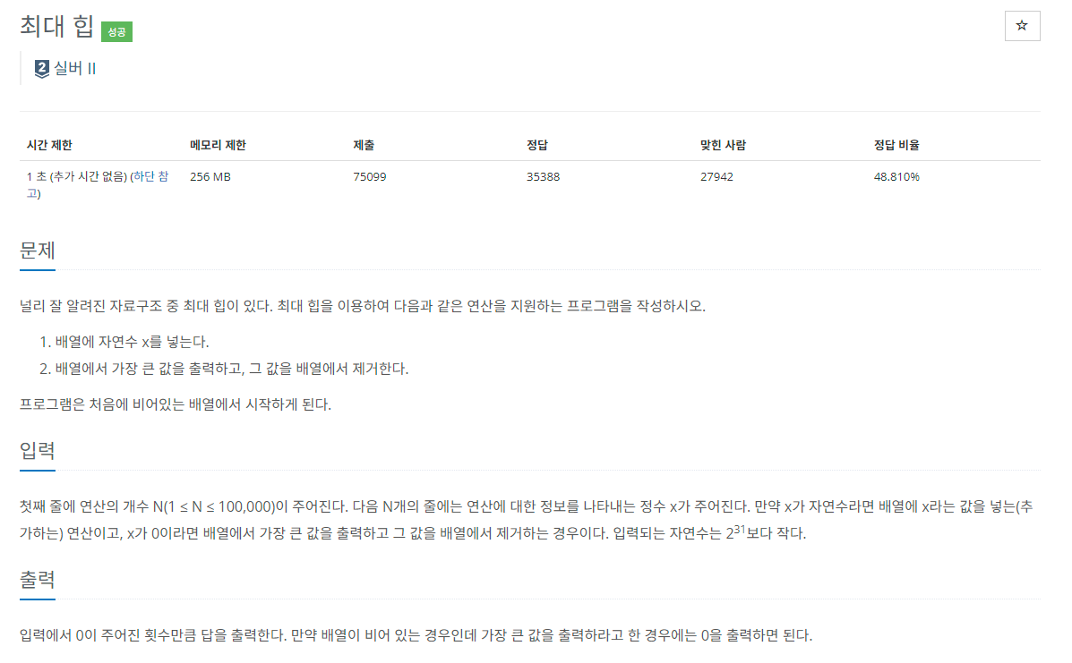 자연수 x를 최대 힙을 사용해 저장한다. 파이썬에서는 최소 힙만 지원하므로 -1을 곱해서 저장하고 출력할 때는 다시 -1를 곱해서 출력한다.