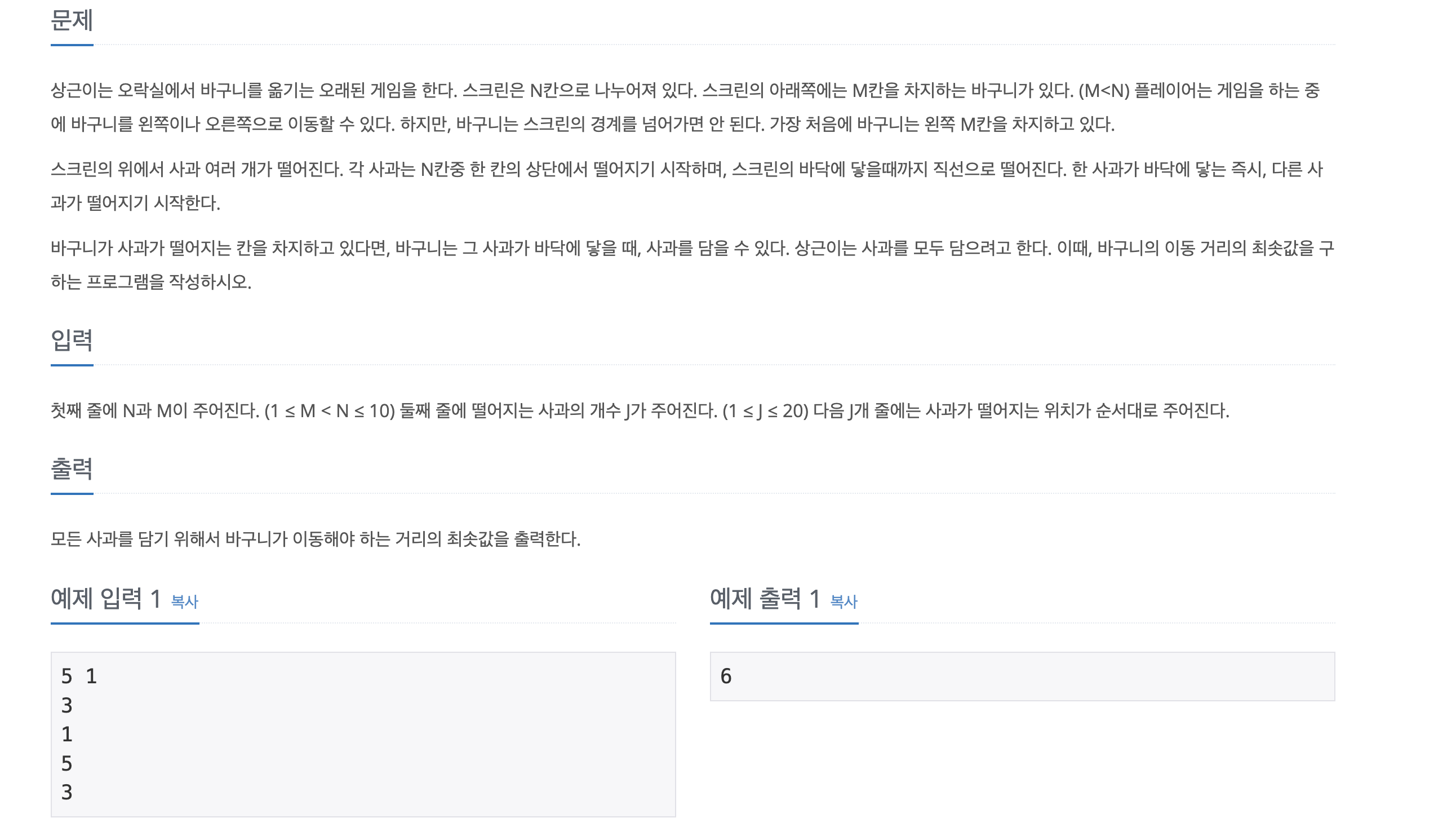 상근이는 오락실에서 바구니를 옮기는 오래된 게임을 한다. 스크린은 N칸으로 나누어져 있다. 스크린의 아래쪽에는 M칸을 차지하는 바구니가 있다. (M<N) 플레이어는 게임을 하는 중에 바구니를