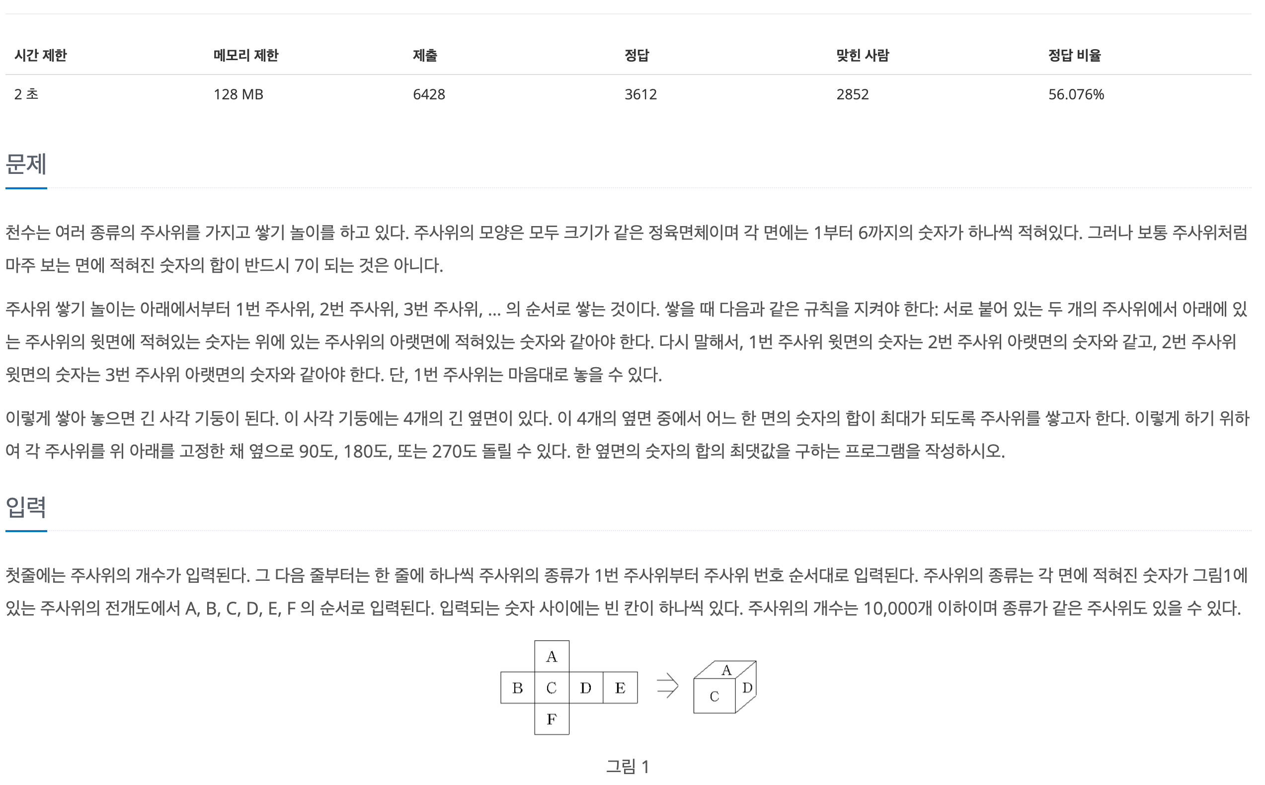 한 쪽 측면에 놓이는 값들의 합중에서 가장 큰 수를 원하기 때문에 한개의 주사위의 옆면에 해당하는 값들중 가장 큰 수만 선정하면 된다. 즉 주사위를 쌓는 경우에 대해서 찾으면 값은 알 수 있게 된다는 의미이다.