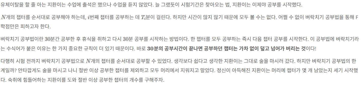 유체이탈을 할 줄 아는 지환이는 수업에 출석은 했으나 수업을 듣지 않았다. 늘 그랬듯이 시험기간은 찾아오는 법, 지환이는 이제야 공부를 시작했다. $N$개의 챕터를 순서대로 공부해야 하는데,