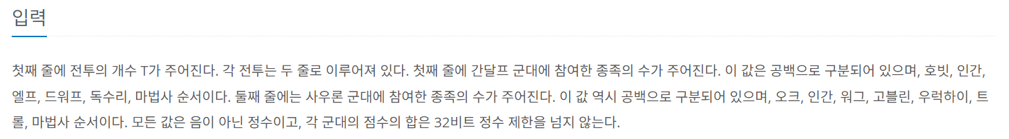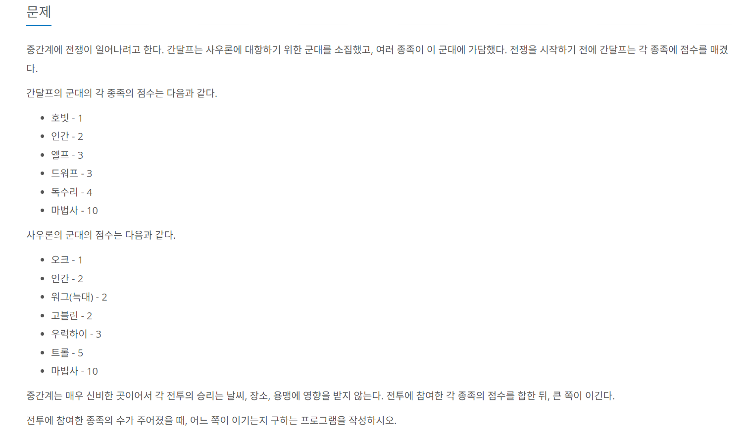 간달프 군대의 점수 합 ans_g, 사우론 군대의 점수 합 ans_s으로 변수 선언과 초기화, 두 군대의 종족들 마다 할당된 점수들에 대한 리스트 두 개를 선언
