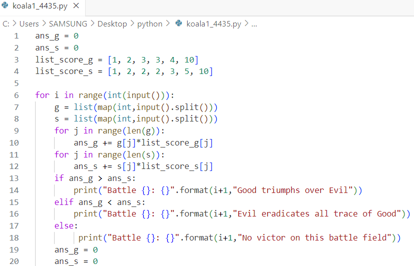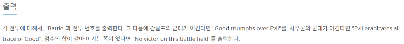 전체 총합을 비교하여비교값에 따라 Battle n(회차): 문제에서 주어진 대사를 출력하도록 하였는데 Battle이 고정이고 n이 회차마다 달라지므로 format을 사용하여 {}안에 회차값인 i + 1을 넣어 코드를 작성하였습니다